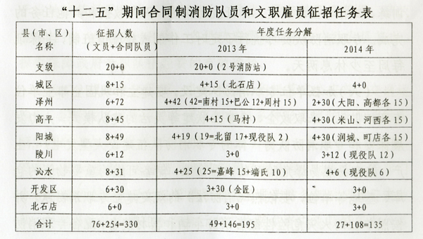 (三)发展合同制消防员。根据山西省消防总队《关于下达“十二五”期间政府专职消防队员和消防文员发展任务的通知》(公消〔2012〕62号)要求,“十二五”期间,我市政府专职消防队员应新增人数254人,消防文员应新增人数76人。各县(市、区)人民政府、开发区管委会要严格按照省人社厅、公安厅制定下发的《山西省公安消防部队合同制消防人员征招和管理暂行办法》的程序自行组织实施;并结合公安部应急救援队伍文件要求,按照城市公安消防队、政府专职消防队每队不少于30人的标准,乡镇政府专职消防队每队不少于l