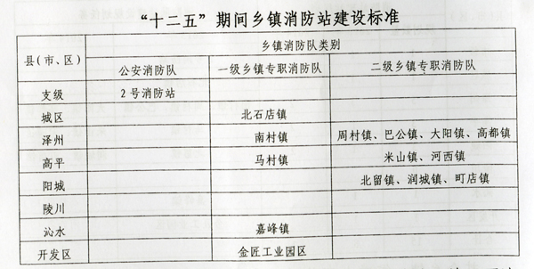 (一)队站建设目标。“十二五”期间,下列未建公安消防队的地方应当建立政府专职消防队:一是消防站数量未达到国家《城市消防站建设标准》规定的县人民政府所在地的镇;二是建成区面积超过五平方公里或者居住人口达到五万人以上的乡镇;三是易燃易爆危险品生产、经营单位和劳动密集型企业密集的乡镇;四是全国和省级重点镇、历史文化名镇;五是省级及以上的经济技术开发区、旅游度假区、高新技术开发区,国家级风景名胜区。