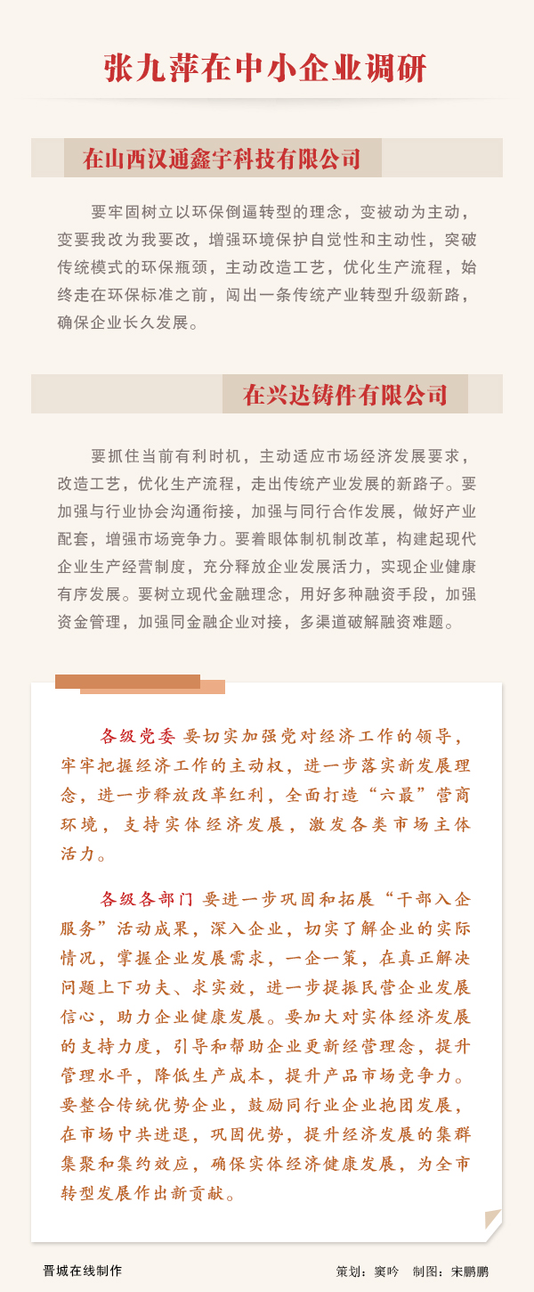 12月25日,市委书记张九萍深入晋城经济技术开发区汉通鑫宇科技有限公司和泽州县兴达铸件有限公司,就实体经济运行情况进行调研。