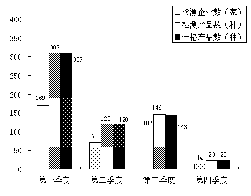 2015年针对362家企(商)业,检测产(商)品598批次,合格产(商)品595批次,合格率为99.50%。第一季度针对169家企(商)业,检测产(商)品309批次,合格产(商)品309批次,合格率为100%。第二季度针对72家企(商)业,检测产(商)品120批次,合格产(商)品120批次,合格率为100%。第三季度针对107家企(商)业,检测产(商)品146批次,合格产(商)品143批次,合格率为97.94%。第四季度针对14家企(商)业,检测产(商)品23批次,合格产(商)品23批次,合格率为100%。详见表2及趋势图。