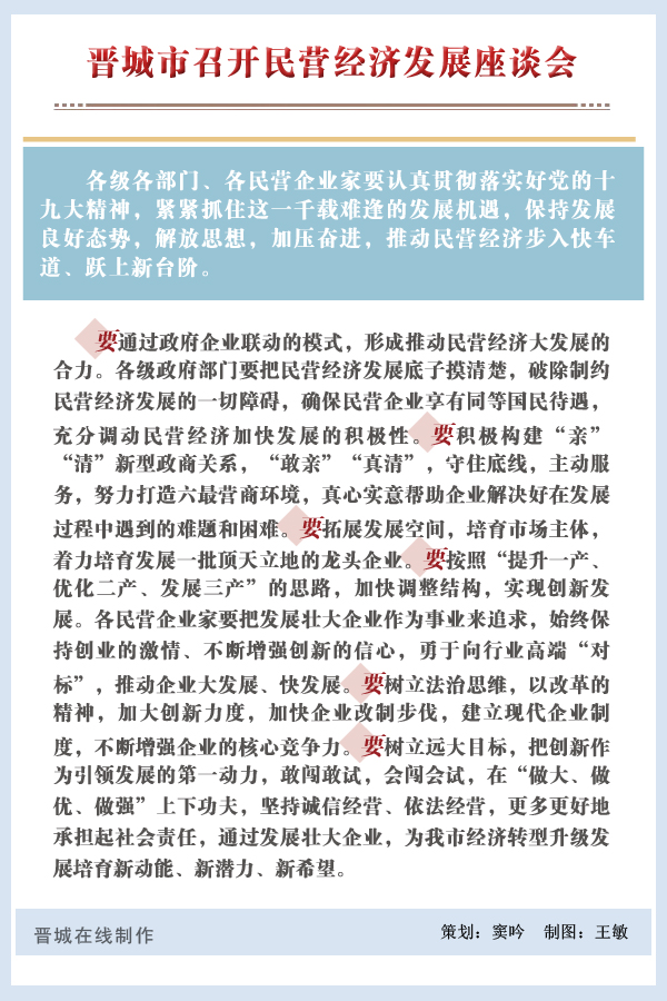 刘锋指出,民营经济是经济发展中最具潜力、最具活力、最具成长性的增长点。党的十九大就鼓励支持民营经济发展作出新部署,为民营经济持续健康发展指明了方向,标志着民营经济将迎来新的历史机遇和进入一个新的发展阶段。就我市而言,已经具备了“天时、地利、人和”的有利条件,发展民营经济大有可为、大有作为。所谓“天时”,就是有十九大精神的指引,有国发42号文件的鼓舞,有省委省政府的支持,民营经济发展恰逢其时。所谓“地利”,就是有多年来积累的民营经济发展基础,有中原城市群核心发展区、山西自贸区主体规划片区的地理和产业优势,民营经济发展条件优越。所谓“人和”,就是有市委市政府高度重视民营经济的政治环境和社会共识,有一大批富有创业激情和经验的民营企业家队伍,民营经济发展前景广阔。各级各部门、各民营企业家要认真贯彻落实好党的十九大精神,紧紧抓住这一千载难逢的发展机遇,保持发展良好态势,解放思想,加压奋进,推动民营经济步入快车道、跃上新台阶。
