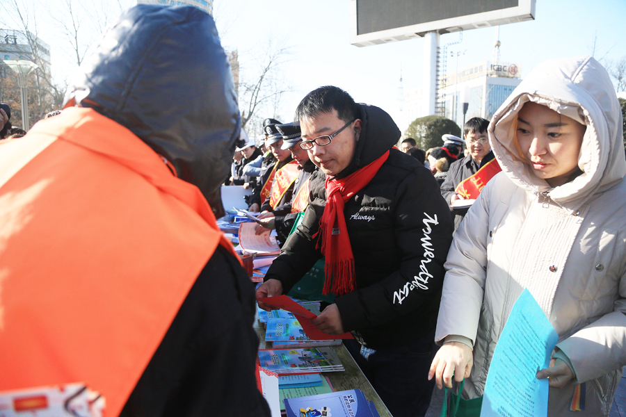 2018年1月10日是全国第32个110宣传日。1月9日,我市在物茂广场举行了以“110守护新时代美好生活”为主题的宣传活动,在市区物茂广场,我市公安以及交通、文化等部门在现场向过往群众发放宣传资料,面对面向市民群众普及报警服务知识。2017年全市110报警服务台共受理警情408562起,平均每小时出警47起,市局110报警服务台接警18万余起。(摄影:田飞)