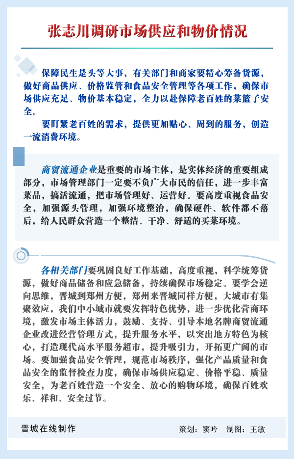 调研中,张志川认真听取了全市“两节”市场供应情况汇报。他指出,从调研情况看,大雪天气市场情况良好,供应充足、价格稳定,市民心里也就不慌了。各相关部门要巩固良好工作基础,高度重视,科学统筹货源,做好商品储备和应急储备,持续确保市场稳定。要学会逆向思维,晋城到郑州方便,郑州来晋城同样方便,大城市有集聚效应,我们中小城市就要发挥特色优势,进一步优化营商环境,激发市场主体活力,鼓励、支持、引导本地名牌商贸流通企业改进经营管理方式,提升服务水平,以突出地方特色为核心,打造现代高水平服务超市,提升吸引力,开拓更广阔的市场。要加强食品安全管理,规范市场秩序,强化产品质量和食品安全的监督检查力度,确保市场供应稳定、价格平稳、质量安全,为老百姓营造一个安全、放心的购物环境,确保百姓欢乐、祥和、安全过节。