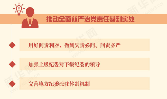 第八,推动全面从严治党责任落到实处。加强对所辖地区和部门党组织履行全面从严治党责任情况的监督检查,用好问责利器,做到失责必问、问责必严。加强上级纪委对下级纪委的领导,完善地方纪委派驻体制机制,强化监督职责,推动管党治党责任全面覆盖、层层传导。