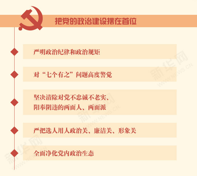 第一,把党的政治建设摆在首位。严明政治纪律和政治规矩,加强对党内政治生活状况、党的路线方针政策和民主集中制等制度执行情况的监督检查,对“七个有之”问题高度警觉,坚决清除对党不忠诚不老实、阳奉阴违的两面人、两面派。聚焦政治立场、政治原则、政治担当和政治纪律,强化监督执纪问责,严把选人用人政治关、廉洁关、形象关,全面净化党内政治生态。
