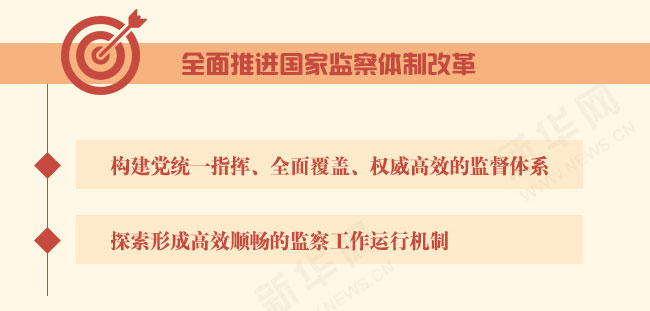 第二,全面推进国家监察体制改革。加强党对反腐败工作的统一领导,构建党统一指挥、全面覆盖、权威高效的监督体系,实现对所有行使公权力的公职人员监察全覆盖。认真履行监督、调查、处置职责,探索形成高效顺畅的监察工作运行机制,实现执纪审查与依法调查有效统一,加强监察机关与审判机关、检察机关、执法部门的工作衔接,把制度优势转化为治理效能。