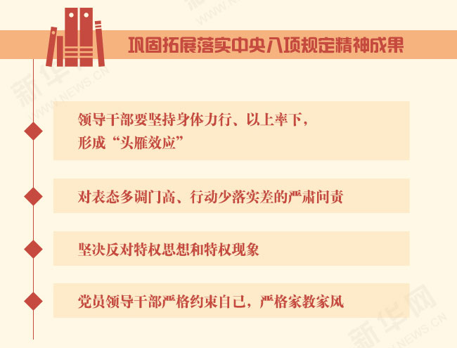 第三,巩固拓展落实中央八项规定精神成果。领导干部要带头转变作风,经常摆摆表现、找找差距,坚持身体力行、以上率下,形成“头雁效应”。发扬钉钉子精神,一个节点一个节点坚守,关注“四风”问题新表现新动向,在反对形式主义、官僚主义上下更大功夫,对表态多调门高、行动少落实差的严肃问责。坚决反对特权思想和特权现象,教育引导党员领导干部增强群众感情,严格约束自己,严格家教家风。