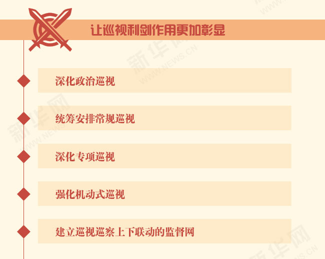第四,让巡视利剑作用更加彰显。制定中央巡视工作规划,贯彻巡视工作方针,以政治建设为统领深化政治巡视,统筹安排常规巡视,深化专项巡视,强化机动式巡视,综合运用巡视成果,狠抓整改落实,提升全覆盖质量。深入开展巡察工作,建立巡视巡察上下联动的监督网。