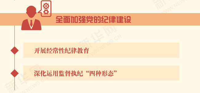 第五,全面加强党的纪律建设。开展经常性纪律教育,发挥先进典型引领示范和反面典型警示教育作用。坚持惩前毖后、治病救人方针,深化运用监督执纪“四种形态”,强化日常监督执纪,有针对性地建章立制,把制度的篱笆扎得更紧。
